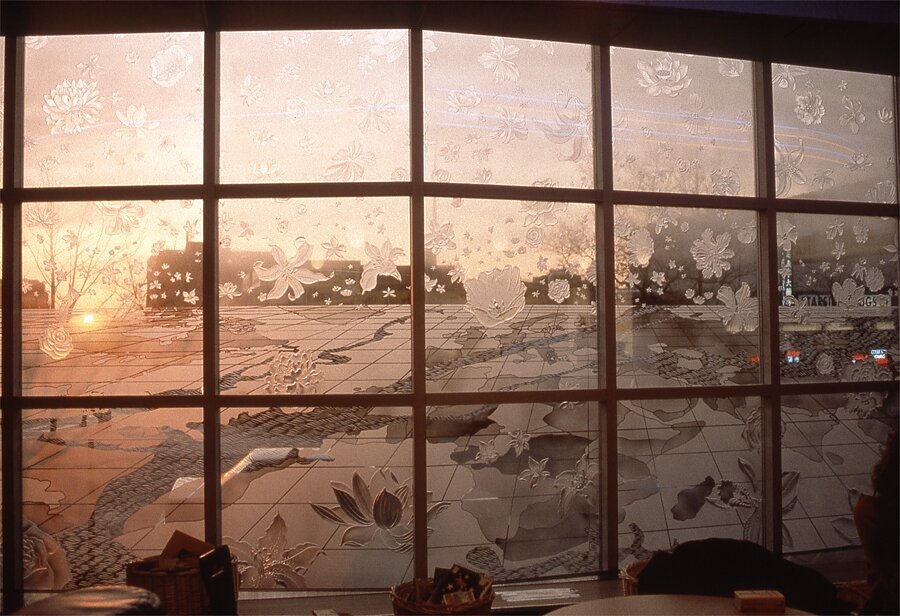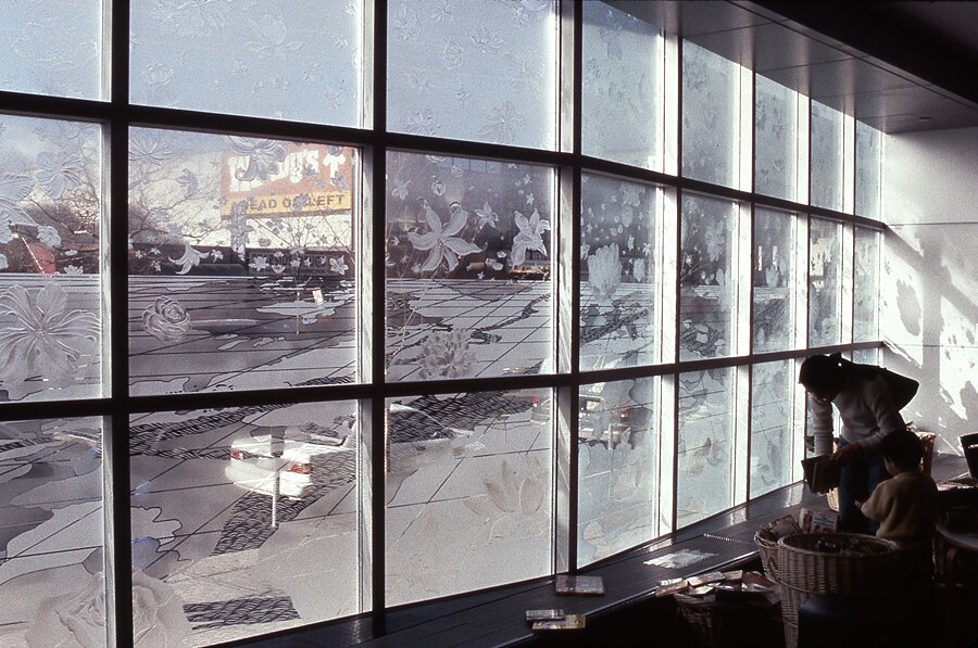 I recall she did a bunch of outdoor installations at Battery Park, then an indoor exhibition using a white Korean hanbok where she wrote words on it. Then, the New York Public Library in Flushing commissioned her to work on their building. She used frosted etched glass to create beautiful flowers that were embedded into the stairs leading into the library. The flowers extended into the children’s wing. We lived in Flushing at the time and I remember taking my young daughter Shannon there, thrilled to be walking on the steps that Yong Soon had beautified.