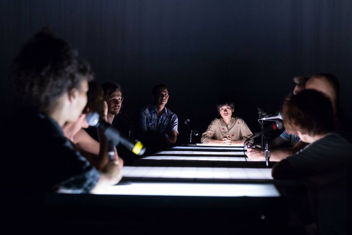 Yoshiko Chuma, artistic director of The School of Hard Knocks (SOHK), has been a creative force in postmodern performance, traveling and interacting with artists in relatively isolated parts of the world since the 1980’s. She has assembled her newest project, π=3.14…First Reading with Three Actresses, through a creative process called “Dry Tech” that emphasizes verbal communication between the artists. Dry Tech traditionally refers to a theatrical rehearsal without the performers, in which the design and technical staff run through the operation of all the technical elements of production, stopping and starting to make adjustments. In contrast, the Chuma-style Dry Tech consists of a meeting, usually not in the performance space, that includes the entire team including performers wherein Chuma leads the team exclusively through the verbal calling out of the technical cues and action and extensive discussion of the work. The method—often interview style—investigates the artists’ perspectives and stories—both artistic and personal. This creative process mines material from the team members’ sharing about how they understand the work and how they view themselves in the context of making the work. Elements of this material may then be incorporated into the production, enabling a multiplicity of distinct and at times conflicting voices and viewpoints to emerge and co-exist.