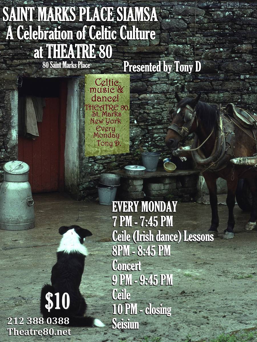 Theatre 80 is delighted to announce a great weekly celebration of Celtic culture beginning December 12th. Tony Demarco, the renowned NYC Irish fiddler is producing a siamsa, an evening of Irish dance, concert and seisiun of Celtic music and more. The evening will be a participatory experience for the audience, including dance lessons and dancing after the concert, and an all welcome seisuin. It is a night when people can do much more than sit and take in the excellent performances.
