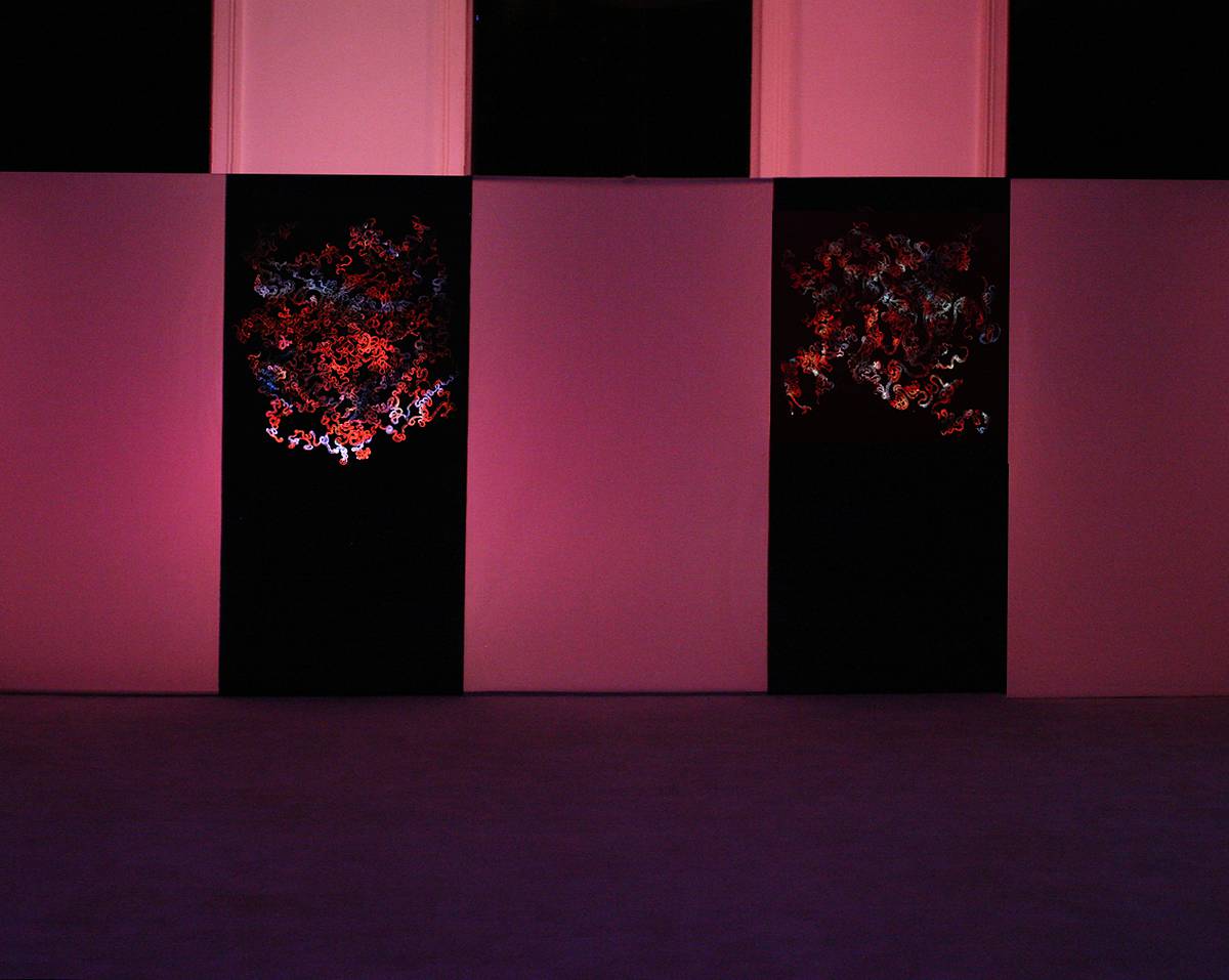 MELA Foundation presents Jung Hee Choi’s recent works, Ahata Anahata, Manifest Unmanifest III, Thursday through Saturday, August 21 – September 11, 2010, 6 pm to midnight, in the MELA Dream House, 275 Church Street, 3rd floor, New York. Ahata Anahata, Manifest Unmanifest III features three large-scale multimedia installations, a series of drawings, videos and a new sound environment, Tonecycle Base 65 Hz, 2:3:7 Vocal Version with La Monte Young, Marian Zazeela and Jung Hee Choi improvising over the implied tonic. The relationship of the improvisations to the drone continuously elaborates the musical meaning of the pitch. This exhibition also premiers the installation work Composition 2010 #1 created with needlepoint drawings on black wrap with video. The drawings are viewed as indiscernibly moving light from video projection glowing through the pinholes creating abstract and analogous representation of Manifest Unmanifest. In a further expansion of the concept of Ahata Anahata, Manifest Unmanifest presented at Tompkins Square Gallery in 2007 and MELA Dream House in 2009, this show illuminates various aspects of Choi’s works and their relationships across different media. Choi has written, “This series of environmental compositions involves the concept of “Manifest, Unmanifest” created with various media including video, drawing, incense, performance and sound. This synthesis of expression collectively creates an intersubjective space as a unified continuum. In rejecting our current mode of perception that stresses ‘sight’ as the primary model of organizing the sensorium, this series of works emphasizes the totality of sense perceptions as a single unit to create a state of immersion. It is especially meaningful for me to show my works in the Dream House space because my work has evolved from the visionary inspiration of La Monte Young and Marian Zazeela. With this exhibition audiences may experience Young and Zazeela’s concept of eternity taking a form of ephemeral presence that is infinitely variable while flowing from the principles they have delineated.“ Jung Hee Choi Works: Composition 2010 #1, 2010, variable dimensions; mixed media: Needlepoint Drawing #3 (36 x 60 inches) Needlepoint Drawing #4 (36 x 60 inches), black wrap with pinholes, translucent paper, video Tonecycle Base 65 Hz, 2:3:7 Vocal Version, 2010, sound environment: the linear superposition of 36 sine wave frequencies and 6 channel voices set in ratios based on the harmonics 2, 3 and 7 imperceptibly ascending toward fixed frequencies and then descending toward the starting frequencies, infinitely revolving as in circles, in parallel and various rates of similar motion to create continuous slow phase shifts with long beat cycles RICE, 1999-2009, variable dimensions, multi-channel video installation Composition 2006 #3 (Spirit), 2006, 60 x 72 in., mixed media: drawing and video AUM (incense calligraphy), 2008, 39 min. 09 sec. loop, video Color (CNN), 2009, 21 min. 23 sec. loop, video Drawings: Composition 2006 #2, 2006, 20 x 24 in., graphite on black paper Composition 2008 #1, 2008, 18 x 24 in., graphite on black paper Composition 2008 #2, 2008, 18 x 24 in., graphite on black paper Composition 2008 #4, 2008, 18 x 24 in., graphite on black paper Composition 2008 #5, 2008, 24 x 36 in., graphite on black paper