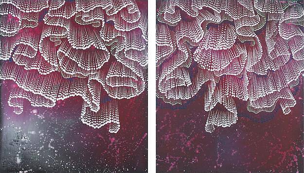 Opening Reception:Thursday, March 31, 6 - 8 PMDC Moore Gallery is proud to present Waiting in the Sky, an exhibition of new work by Barbara Takenaga. This is the artist’s fourth solo exhibition at the gallery. The exhibition will comprise a series of large-scale paintings, on linen and panel, and a wall-piece related to her current installation at MASS MoCA. The exhibition is accompanied by a fully illustrated catalog with an essay written by American poet and critic John Yau.Barbara Takenaga’s new body of work continues the artist’s eloquent inquiry into the emotional weight of imagined spaces and natural phenomena. Each carefully constructed composition questions the boundaries of the known by offering visual translations of the ever-changing nature of the physical world.Through the artist’s process of random background pours of paint and an ordered, labor-intensive approach, she constructs funnels, geodes, maps, and webs with her signature vocabulary of dots and splashes, outlined and traced in vivid shimmery hues of acrylic. Once fully realized, Takenaga’s compositions present portals or aerial views from places hovering above earth where an elastic reality pervades and parallel worlds could be the norm rather than the exception.Many of the painting titles, Amber, Floater, Twister or Aura/Arch present a duality of meaning and like the images themselves - land, city, and outer space - shape-shift, fluctuating between the positive and negative, the microscopic and infinite. The power of these paintings lies in their ambiguity, and is where Takenaga stakes out her own unique territory, nimbly making reference to familiar objects and spaces while simultaneously placing our sense of those things in question.Barbara Takenaga’s installation Nebraska is currently on view at MASS MoCA in North Adams, MA. Her work is in numerous public and private collections. Takenaga is a Professor of Art at Williams College. She lives and works in New York City.