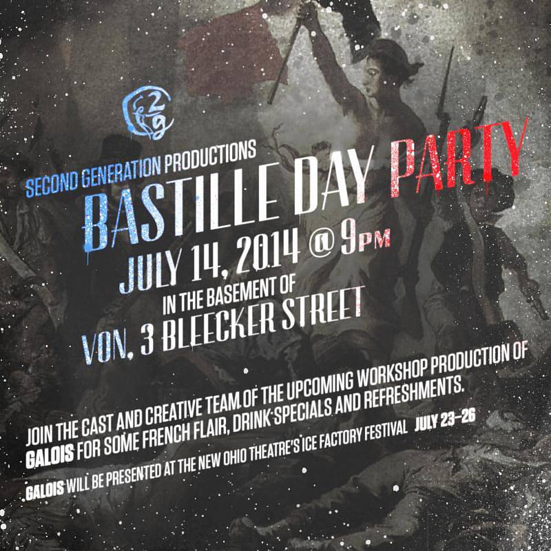 Join Second Generation Productions on Monday, July 14th starting at 9pm for a Bastille Day Party in the basement of Von, 3 Bleecker Street. Yes, they are an Asian American theater company throwing une soirée pour La Fête Nationale and it’s all in honor of our upcoming Ice Factory workshop production of Galois, based on the life of French mathematician and revolutionary Evariste Galois. The cast and creative team will be there.
