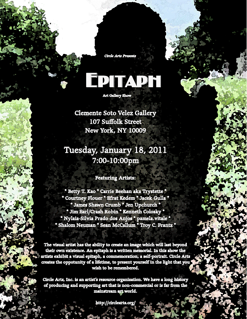 The visual artist has the ability to create an image which will last beyond their own existence. An epitaph is a written memorial. In this show the artists exhibit a visual epitaph, a commemoration, a self-portrait. We will create the opportunity to present yourself in the light that you wish to be remembered. A free night of artwork, music, and performance.