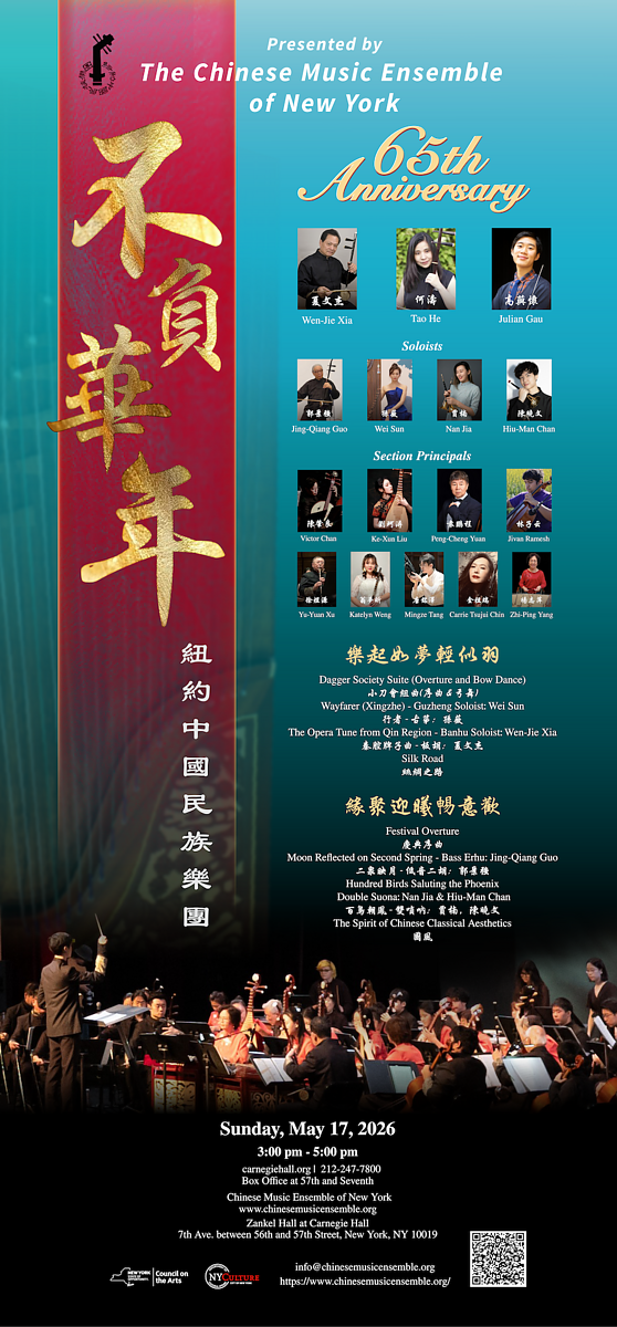 Founded in 1961, the Chinese Music Ensemble of New York (CMENY) celebrates its 65th Anniversary in 2026. The May 17 concert program will showcase the most cherished classical pieces CMENY has presented over the past six decades. The repertoire selections will also take the audience on a journey through the enchanting evolution and exciting growth of Asian heritage music throughout those six decades.