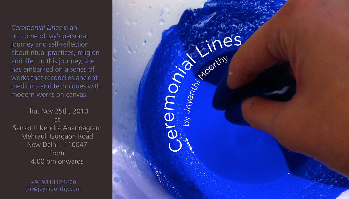 Ceremonial Lines is an outcome of Jay’s personal journey and self-reflection about ritual practices, religion and life. In this journey, she has embarked on a series of works that reconciles ancient mediums and techniques with modern works on canvas. Thu, Nov 25th, 2010 4.00 pm onwards