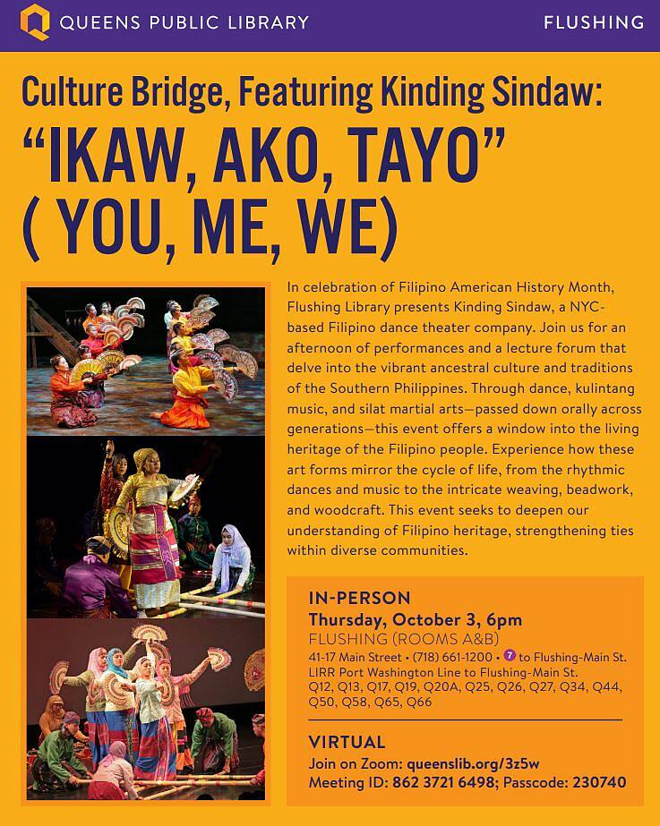 In celebration of Filipino American History Month, Flushing Library presents Kinding Sindaw, a NYC-based Filipino dance theater company. Join for an afternoon of performances and a lecture forum that delve into the vibrant ancestral culture and traditions of the Southern Philippines. Through dance, kulintang music, and silat martial arts—passed down orally across generations—this event offers a window into the living heritage of the Filipino people. Experience how these art forms mirror the cycle of life, from the rhythmic dances and music to the intricate weaving, beadwork, and woodcraft. This event seeks to deepen our understanding of heritage, strengthening ties within diverse communities.