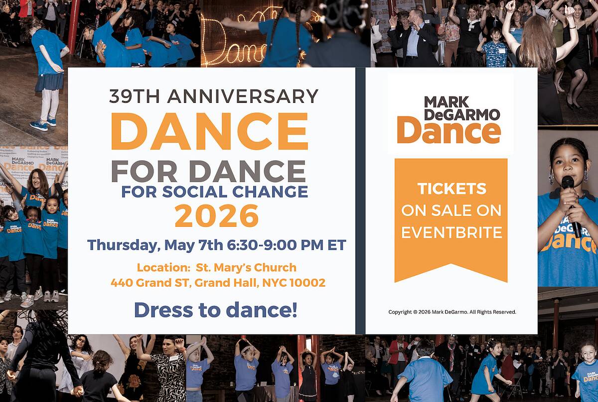Mark DeGarmo Dance’s Dance for Dance for Social Change 2026 celebrates MDD’s 39th and 44th anniversaries as a leading NYC not-for-profit dance organization dedicated to education, performance, and intercultural community-building. The community event celebrates a 39- and 44-year commitment to provide an evidence-based dance program to the least-resourced public elementary students, schools, families, and communities across NYC. Without their support, funding and dedication their school partners rarely provide evidence-based dance education programs. The celebration includes a presentation with refreshments, a silent auction, a dance lesson, dancing, and students performing. They honor internationally recognized performer, teacher, choreographer, and author, Dr. Daniel Lewis, with their “Educational Visionary” Lifetime Achievement Award 2026 presented by Dante Puleio, Artistic Director of the José Limón Dance Company.