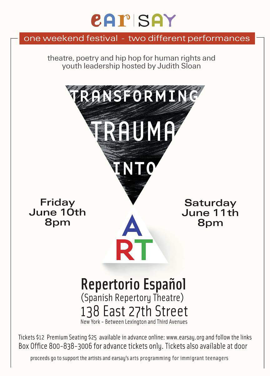 Advance Tickets available online go to: http://www.earsay.org/ and click on BUY TICKETS NOW ________________________________________________________________________________ Featured performances by: Judith Sloan excerpts from her work in development Yo Miss! Teaching Inside the Cultural Divide actress/writer Judith Sloan remixes stories from twenty years of reporting on and teaching immigrant and refugee teenagers and incarcerated youth as they grapple with the cataclysmic global events that shaped them. LaBruja With her debut album Brujalicious, this dynamic, gifted performer infuses hip-hop and reggaeton with her irresistible blend of potent intelligence, hot sensuality and lyrical skill. opening acts: students from EarSay’s Youth Theatre Program and Bridget Kelso in an excerpt from Slide Show: The Evolution of Radical Feminist Theology, Bridget Kelso weaves together all the small moments of her life into big stories. Saturday Night show followed by a discussion about art and social change moderated by Martha Diaz, Founding Director Hip Hop Education Center with the participating artists and special guests: Abran Maldonado from PEACE/H2ED, and Hasan Salaam __________________________________________________________________________ Repertorio Español (Spanish Repertory Theater) 138 East 27th Street New York, NY 10016 Between Lexington and Third Avenues Tickets $12 Premium Seating $25 available in advance online: http://www.earsay.org/ and follow the links Advance tickets by phone: 800-838-3006 proceeds go to support the artists and EarSay’s arts programming for immigrant teenagers —————— Transforming Trauma Into Art is a project of EarSay directed by Judith Sloan in partnership with the International High School at LaGuardia Community College supported in part by Viper Records, LaGuardia Liberty Scholars, The Office of Council Member Jimmy VanBramer, and public funds from the New York City Department of Cultural Affairs, in partnership with the City Council Facebook event link: http://www.facebook.com/event.php?eid=131712850237674 http://www.facebook.com/EarSay/