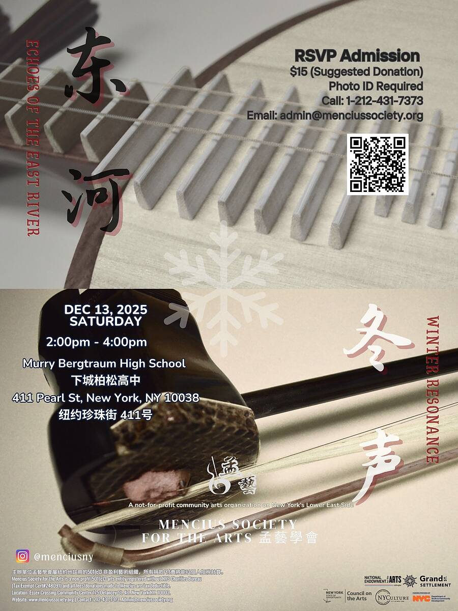 Echoes of the East River: Winter Resonance 东河冬声, is a vibrant winter concert celebrating Chinese musical traditions and intergenerational creativity. Featuring the EastRiver Ensemble and Mencius community orchestras, this performance blends folk, jazz, and contemporary sounds, bringing together artists of all ages from the Lower East Side community.