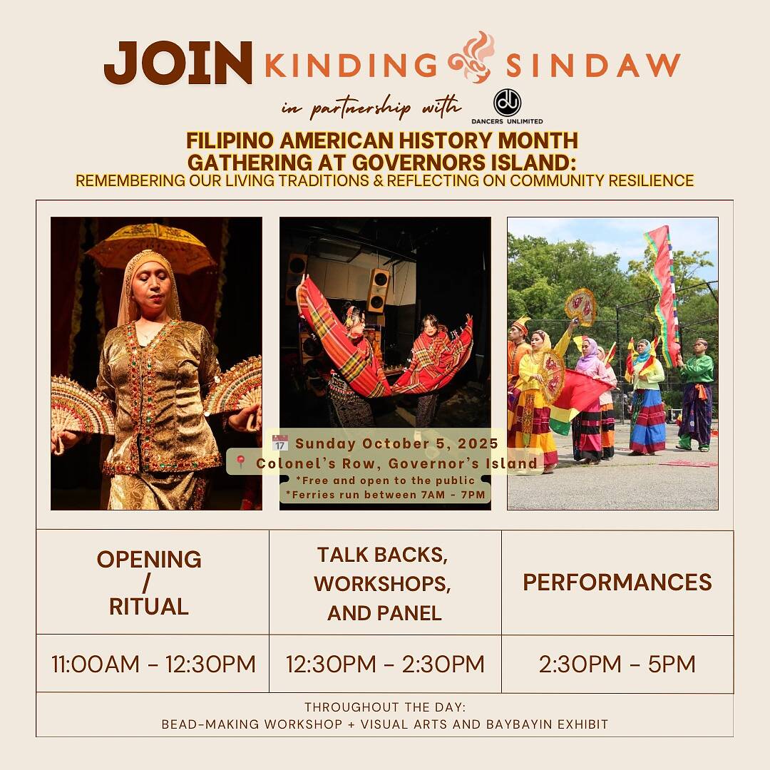 In celebration of Filipino American History Month, Kinding Sindaw brings the legendary Rinayung, the magical boat of Bantogen from the epic Darangen, to symbolically sail the Hudson River and dock at Governors Island. The daylong event highlights living traditions of the Philippines through performance, craft, ritual, and storytelling, featuring master artists, tradition-bearers, and diaspora voices, grounding ourselves in the tradition of Filipino strength and heritage.