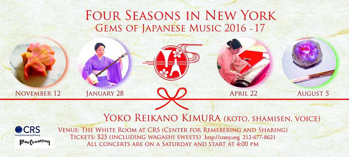CRS & Mar Creation, Inc. invite you to discover traditional Japanese music by the acclaimed koto and shamisen player Yoko Reikano Kimura, offered together with an exclusive taste of beautiful Japanese seasonal sweets prepared by Rin NYC. The next concert will take place on Saturday, January 28, 2017 at 4 pm at CRS. Tickets are $25 and include delicious wagashi (sweets). Seating is limited and advanced purchased (online, by phone 212-677-8621, or in person at CRS) is encouraged.