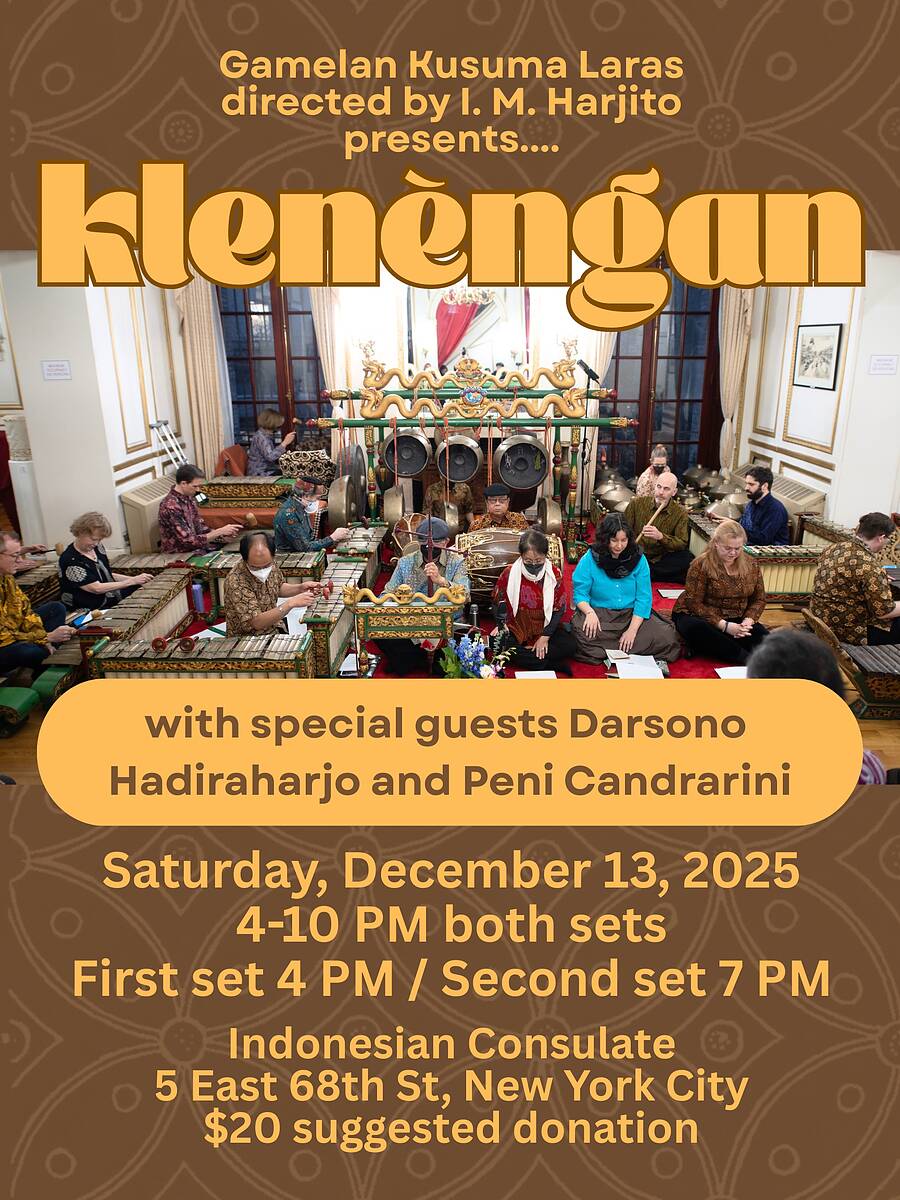 Gamelan Kusuma Laras is directed by I.M. Harjito. This klenèngan will feature special guests Darsono Hadiraharjo and Peni Candrarini.
