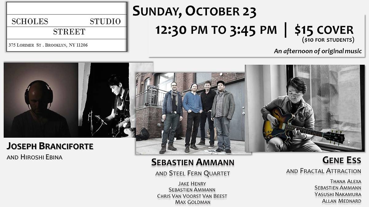 On Oct 23, Joseph Branciforte, Sebastien Ammann and Gene Ess will present an afternoon of original music at Scholes Street Studio. The concert will start at 11:45AM and will feature 3 bands. First Set - Sound artists Joseph Branciforte and Hiroshi Ebina present a set of ambient/experimental music incorporating Fender Rhodes, glockenspiel, modular synthesizers, laptop, found objects, and an array of looping devices.Second Set - Sebastien Ammann and Steel Fern Quartet. Materializing out of the distinct energies of each band member, Steel Fern brings to life compositions of all four musicians and creates an ever changing set of original music and improvisations. Jake Henry - trumpet, Sebastien Ammann - piano, Chris van Voorst van Beest - bass, Max Goldman - drumsThird Set - Gene Ess and Fractal Attraction will perform original works from their new album “Absurdist Theater”. The band features Thana Alexa on voice, Yasushi Nakamura on bass, Gene Ess on guitar, guest Sebastien Ammann on piano, and Allan Mednard on drums.