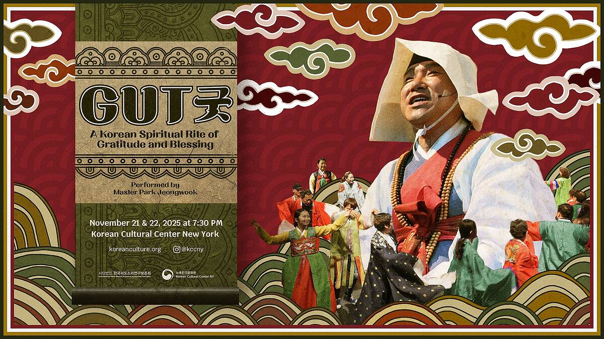 Korean Cultural Center New York presents GUT on November 21 and 22 — a traditional Korean shamanistic ritual performance that embodies the purest form of Korea’s total art, combining music, dance, and spiritual expression. As one of Korea’s Intangible Cultural Heritages, Cheolmuri-GUT bridges art and life, humanity and divinity, offering audiences a profound encounter with Korea’s centuries-old spiritual tradition. Admission is free, pre-registration required.