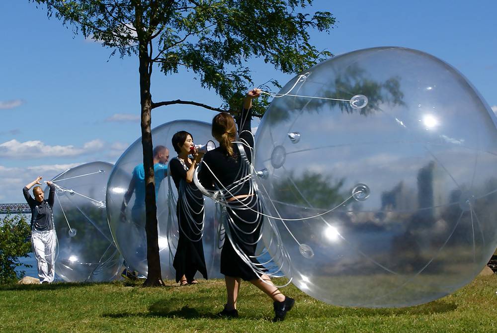 High Tide A magical art installation and performance piece by Lucia Warck-Meister for the Dumbo Arts Festival in which musician -Kyoko Kitamura- and dancers - Megan Ward, Sarah Pope and Korhan Basaran, choreographed by Mark Lamb- perform with 7’ spheres and respond to the river’s ebbs and flows. Representing the tide rising and receding, the giant bubbles appear as if deposited at shore by the river’s turbulence, giving the “musical genies” of the river time to perform before being swallowed again by the deep sea. The performance will take place everyday from 9/24 (Fri) through 9/26 (Sun), at 3pm, and lasts for 10 minutes. The impressive spheres will be left on display between performances.