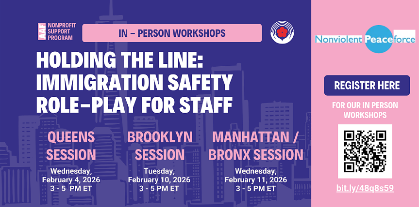 The Asian American Federation is hosting three in-person immigration role-play workshops in partnership with the Nonviolent Peaceforce. These sessions are designed to equip nonprofit staff with concrete tools to respond to ICE at the office or in the field. Each workshop focuses on practical, scenario-based role plays on safety, de-escalation, and trauma-informed response, including what staff can do if an encounter escalates or ICE does not follow policy.