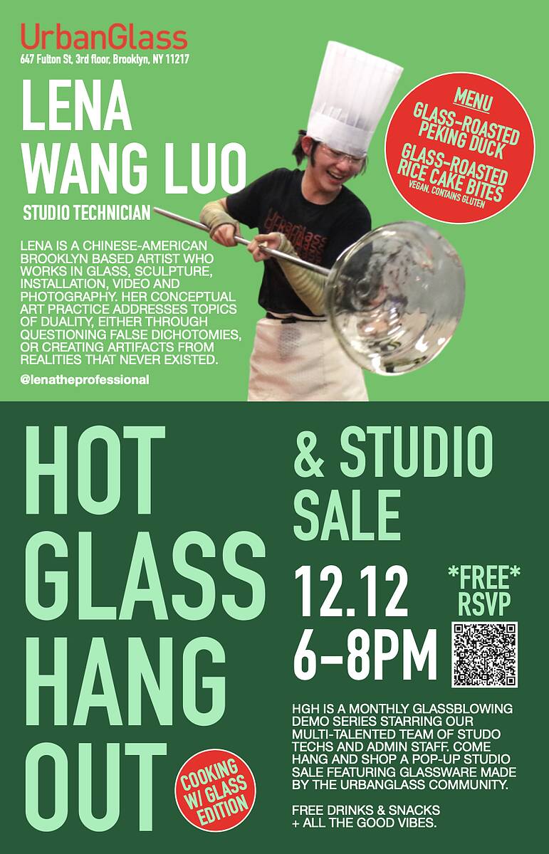The December 2025 Hot Glass Hangout will feature Chinese-American artist Lena Wang Luo and Taiwanese artist Molmol Kuo. Together, they will attempt to cook and serve Peking duck with hot glass within 2 hours. Starting with 2150°F molten glass, Lena will be shaping and blowing glass with the objective of using the end product as a heat source and cooking tool that will encompass the bird. Molmol will be flame working borosilicate glass in order to cook the bird from the inside out.