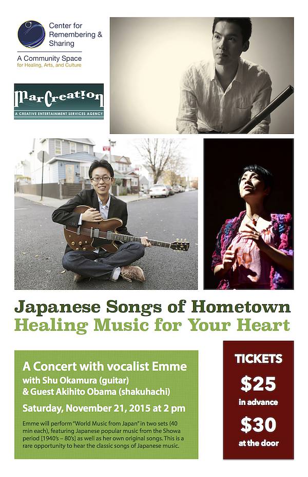 CRS (Center for Remembering & Sharing) and Mar Creation, Inc. invite you to join us for a concert by the Japanese singer Emme on Saturday, November 21, 2015 at 2pm. Emme will perform “World Music from Japan” in two sets (40 min each), featuring Japanese popular music from the Showa period [1940’s – 80’s] as well as her own original songs. This is a rare opportunity to hear the classics of traditional and contemporary Japanese music that Japanese people truly love. Joining her will be Shu Odamura on guitar and guest Akihito Obama on shakuhachi.