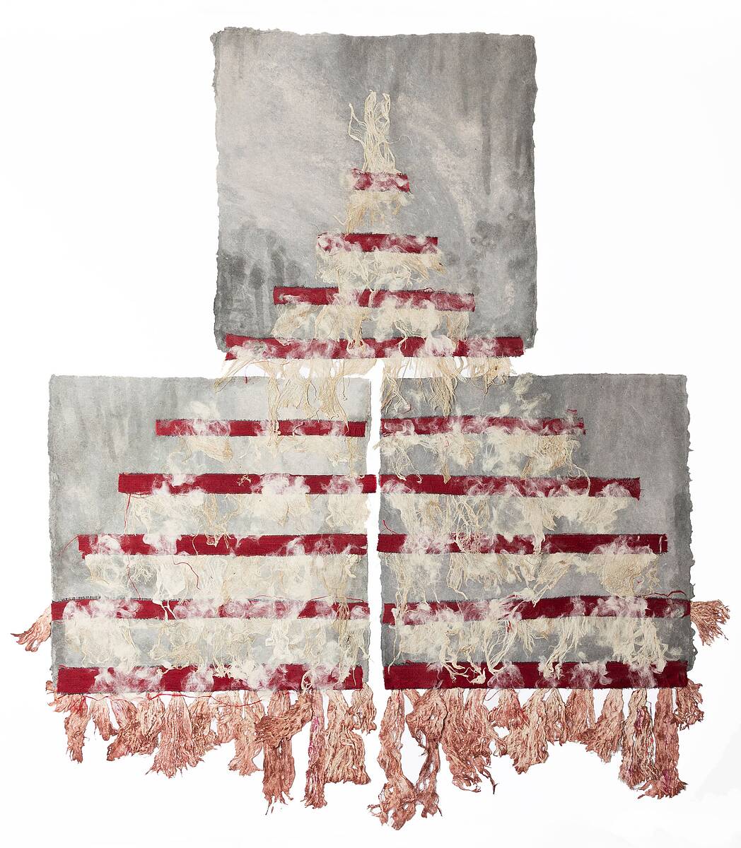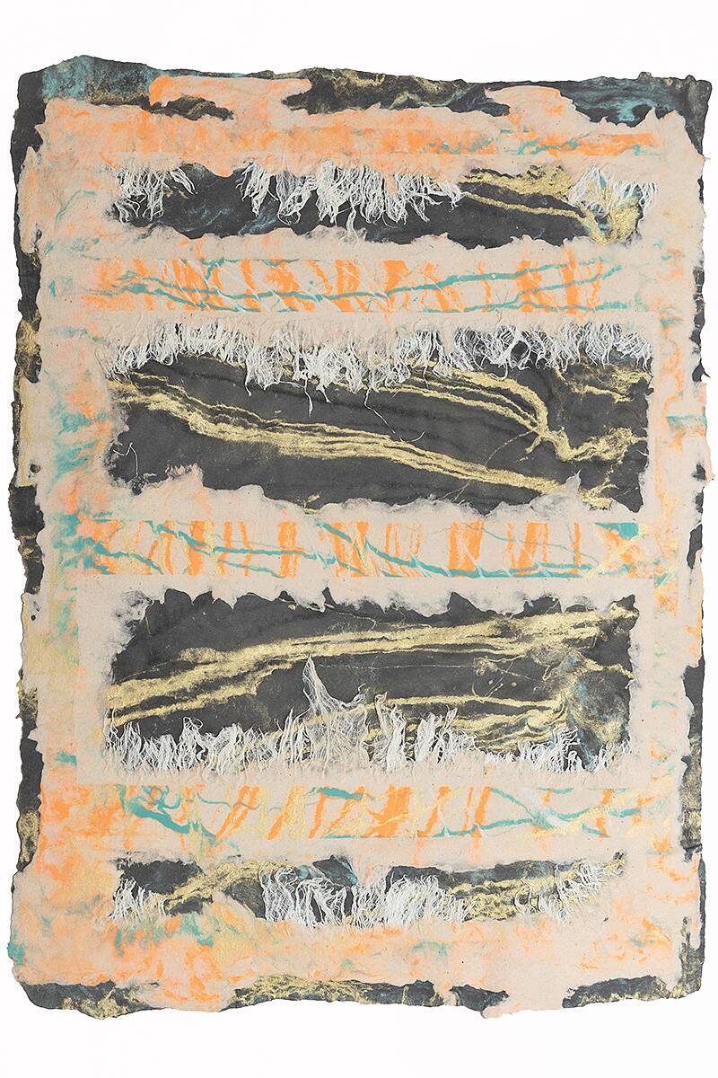 “A state of fray captures that in-between moment when possibility is becoming and certainty unwinds. This body of work is a deeper look at, into and across the raw edges of things. Under a magnified lens, paper appears as a complex, interconnected web of fibers. Poetically, Thich Nhat Hanh described this as interbeing. I explore relationalities through material such as mulberry fiber, silk, and worn sacred cloth, engaging with the cultural narratives they embody. Cloth that has been worn by people can speak to subtle sensory worlds, steep us in symbolism or stories of the past, ushering forth new rituals. Taking form as dendritic extensions, stitching motifs, veils of pulp, or imperceptible orange specks of fabric, edges converge to become more than the sum of their parts. The intertwining network is a transitional zone, a dynamic interfacing between matter and metaphysical epistemologies. All edges are flows of fray. Impermanence as no arrival of home, yet emergence, ever-present.”