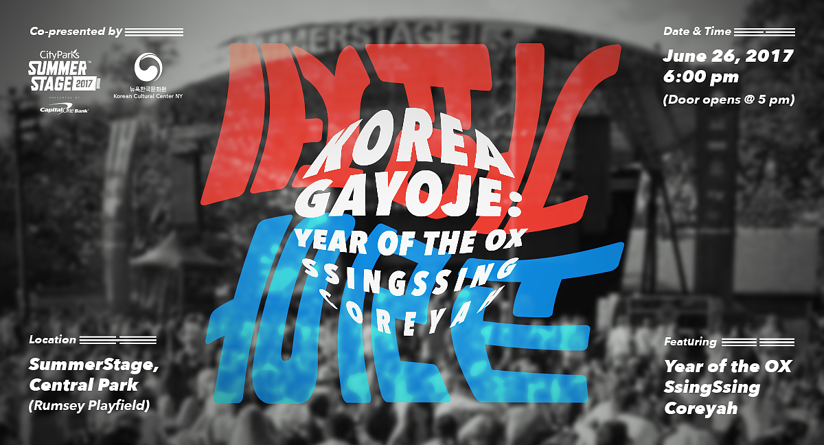 Korea GAYOJE is presented by SummerStage and the Korean Cultural Center New York, and is supported by SORI, the Korea Arts Management Service, and Ministry of Culture, Sports and Tourism as part of the Traveling Korean Arts project as well as the Korean Culture Day 2017.