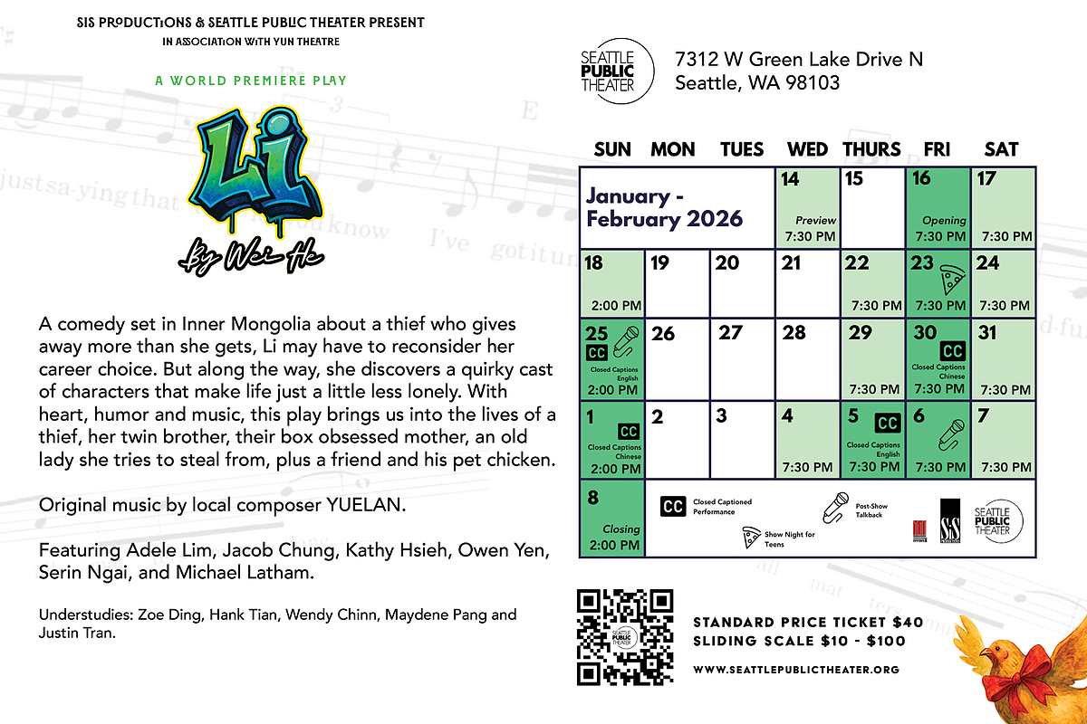 Li is directed by Christie Zhao and features original music by Gregory Award Winning composer YUELAN. The performance schedule also includes English and Chinese captioned performances, and post-play talk-backs. The cast showcases Adele Lim, Jacob Chung, Serin Ngai, Kathy Hsieh, Owen Yen, and Michael Latham.