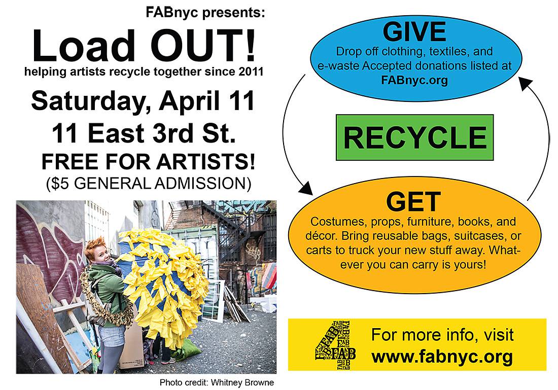 FABnyc is hosting Load OUT!, a creative recycling and repurposing riot during which we bring together gently used materials from arts organizations throughout the East Village and LES. Take home costumes, props, and furniture for your next artistic endeavor!In 2010, we noticed that local theaters were “loading out” sets and materials directly into dumpsters after productions ended their runs. Not only were the materials being disposed of inefficiently and unsustainably, but were often of great value to other artists. As a creative response, FABnyc initiated “Load OUT!” inviting neighborhood arts and cultural groups, non-profits, and community members to donate sets, costumes, props and office equipment they no longer needed, to be made available to other artists. Admission to the swap event is 5 dollars for the general public and free for artists and art students.Special thanks to DMAC-Duo Multicultural Arts Center and Rod Rodgers Dance Company for their in-kind donation of space.