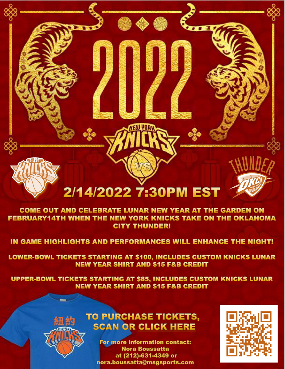 Come celebrate Lunar New Year when the New York Knicks take on the Oklahoma City Thunder! Special Knicks Lunar New Year t-shirt giveaway included.