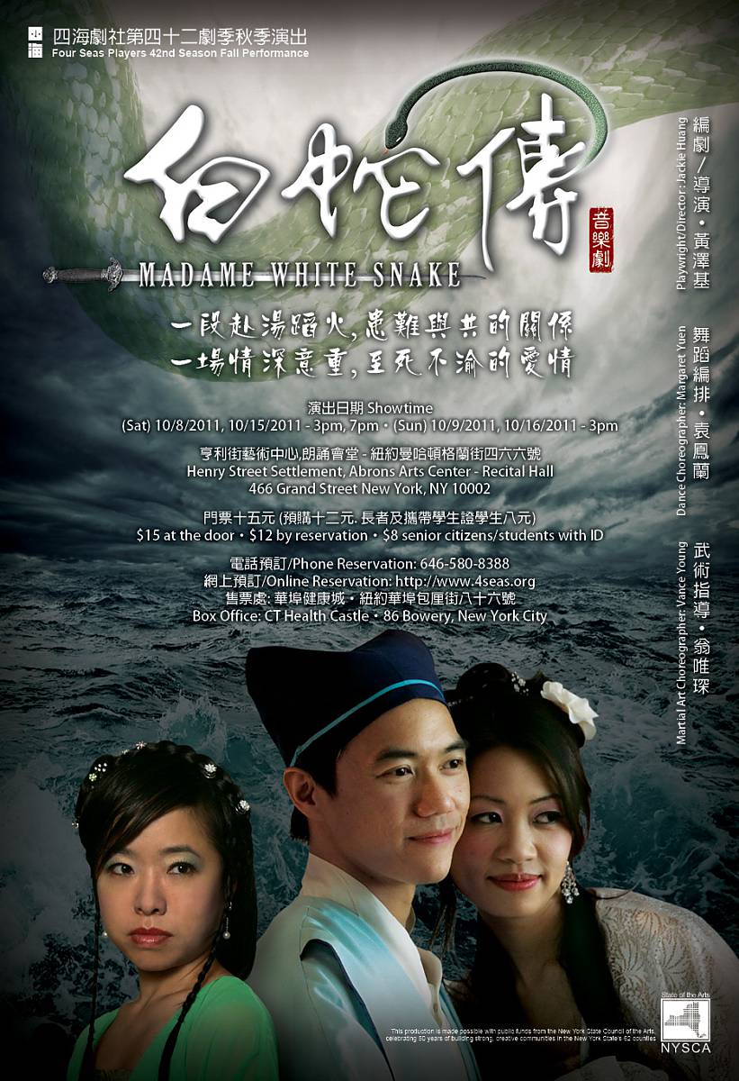 Adapted from the classic Chinese tale, “Legend of the White Snake”, from the Ming Dynasty, this new two-act musical created by Jackie Huang is set in the Southern Song Dynasty of China. After many years of practice, White Snake (Bai Suzhen) and her maid and confidante Green Snake (Xiao Qing) are able to transform into human forms. While enjoying their power and worldly surroundings, they meet a young scholar Xu Xian. White Snake falls in love with the Scholar and the two eventually marry. Feeling neglected, Green Snake becomes jealous of their romance and at once makes an attempt to seduce the Scholar. A Buddhist monk (Fa Hai), recognizing the unusual romance, is determined to break up the pair. The Scholar is shown the true identity of White Snake and, in confusion, leaves her. In revenge, Green Snake tries to undermine the Monk’s power by seducing him as well. A clash between the Monk and the two snake-transformed beauties ensues. The unexpected outcome is anything but traditional.