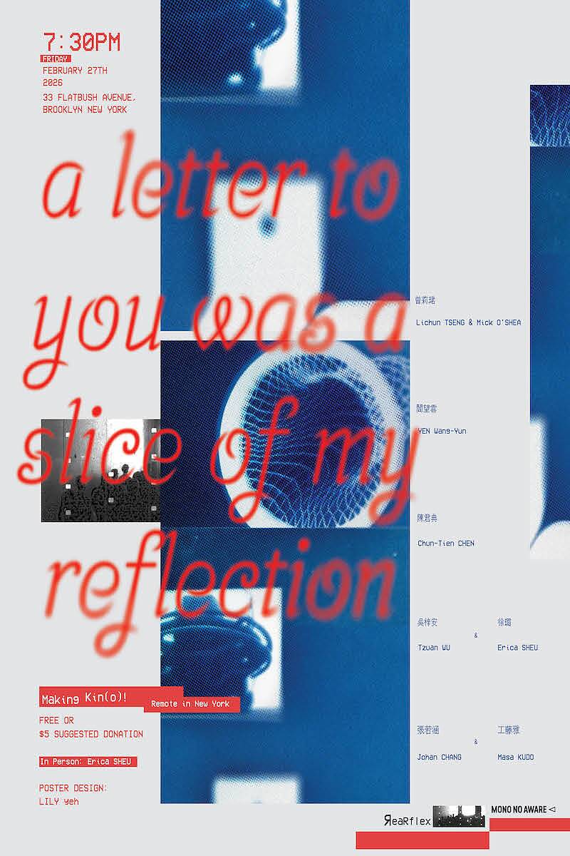 ReaRflex’s main members, Johan Chang, Erica Sheu, and Tzuan Wu, travel with film screening programs. Past engagements include Worm (Rotterdam, Netherlands), Center Kanuma (Tochigi, Japan), Tamagawa University (Tokyo, Japan), Whammy! Analog media (Los Angeles, USA), among others.