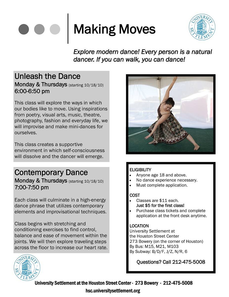 Explore modern dance! Every person is a natural dancer. If you can walk, you can dance! Unleash the Dance explores the ways in which our bodies like to move. using inspirations from poetry, visual arts, music, theatre, photography, fashion and everyday life, we will improvise and make mini-dances for ourselves.This class creates a supportive environment in which self-consciousness will dissolve and the dancer will emerge. Mondays & Thursdays 6-6:55 pm Contemporary Dance culminates in a high-energy dance phrase that utilizes contemporary elements and improvisational techniques. Class begins with stretching and conditioning exercises to find control, balance and ease of movement within the joints. We will then explore traveling steps across the floor to increase our heart rate. Mondays & Thursdays 7-7:55 pm Classes are $11 each. Just $5 for the first class! Purchase class tickets and complete application at the front desk anytime. Location: Houston Street Center, 273 Bowery, New York, NY * Anyone age 18 and above. * No dance experience necessary. * Must complete application. * call 212-475-5008 Email me for a discount deal of $11 for both classes (same day)