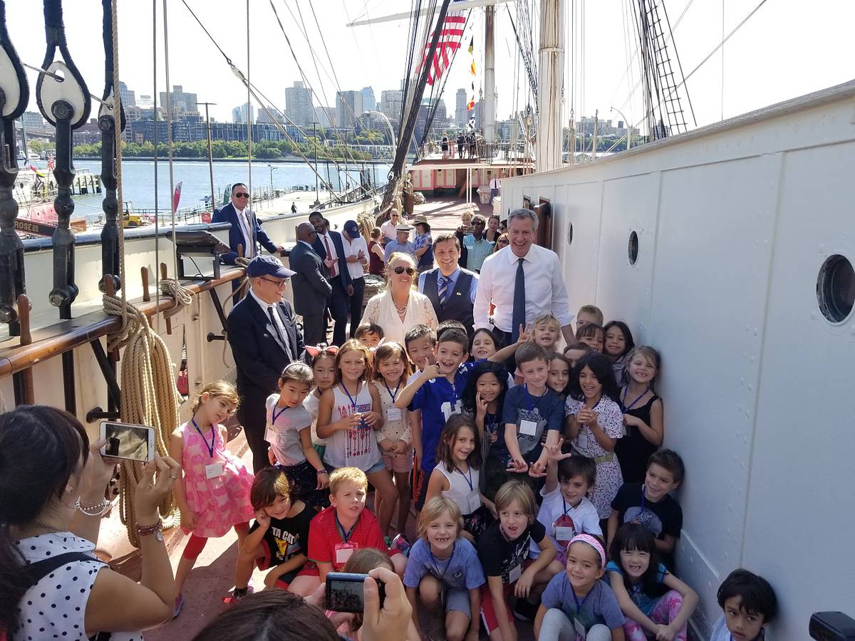 New York City Mayor Bill de Blasio; Hon. Gale A. Brewer, Manhattan Borough President; and New York City Department of Cultural Affairs Commissioner Tom Finkelpearl visited the restored 1885 sailing ship Wavertree for a tour of the recently renovated flagship. The trio, with Captain Jonathan Boulware, executive director of the museum, even helped students of The Spruce Street School students set sails!