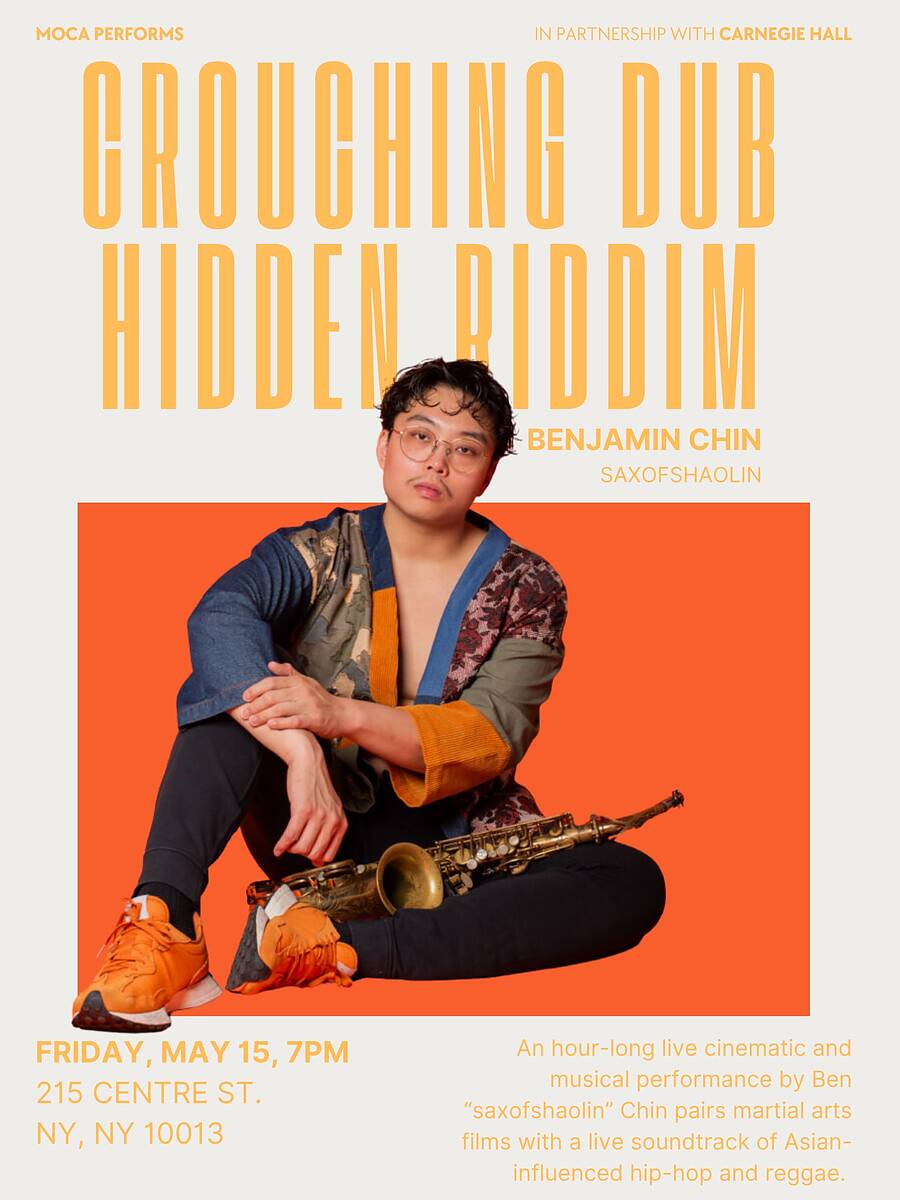An hour-long live cinematic and musical performance by Ben “saxofshaolin” Chin pairs martial arts films with a live soundtrack of Asian-influenced hip-hop and reggae. Martial arts films and Black diasporic music have long served as entry points into Asian and Black cultures. The program reimagines these familiar cultural forms while confronting the stereotypes that have long shaped their reception. This performance highlights the deep-rooted connections between Black and Asian diasporas while imagining new models for collaboration, solidarity, and cultural empowerment.