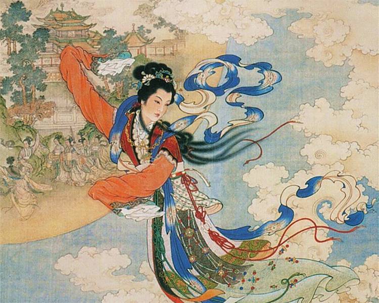 The all-pervading demigoddess who grins provocatively as we glory in her silver glow. Chang E (pronounced Chong Eeh), so the ancient Chinese legend goes, escapes her famous hunter of a husband on earth to fly to the moon—hovering in immortality—with a little help of an illicit magic potion. Her story has been interpreted and scrutinized through millennia: She has been seen as a symbol of feminine selfishness, disloyalty, and cunning on the one hand, and, on the other, as the female archetype who desires eternal beauty, fertility, and longevity, and as the muse of poetic inspiration.