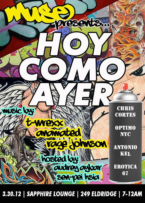 ::MUSE:: The Source of Inspiration Once a month we gather to showcase and celebrate all that moves and inspires us. Dance, Art, Music, Spoken Word, Film and Everything in Between. Graffiti has been an important urban art form since its inception in New York City in the 60’s and 70’s. It is an artform that derives from ancient times. It is only fitting we pay homage with 4 amazing artists that have been making their stamp in this world through various decades. MUSE Presents: Hoy Como Ayer (Yesterday’s Like Today). ——–Hosted by: Audrey Aybar & Sen-Pei Hsia ——–Music By: DJ AnaMated, DJ T-wreXX & Rage Johnson Featuring The Art Of: Chris Cortez Optimo NYC - (Joshua Pacheco) Antonio Kel Erotica 67 Sneakers provided by HIP HOP USA Treats by: Batter Sweet Photography by: Teddy Adolphe Friday, March 30th 7PM to 12:00AM $3 Donation $4 Beer $5 Drinks Sapphire Lounge/Gallery 249 Eldridge St Between E. Houston & Stanton Street Thank you so much for your love & support! xoxo The ladies of MUSE (Sen-Pei Hsia, Audrey Aybar, Ana Toledo)