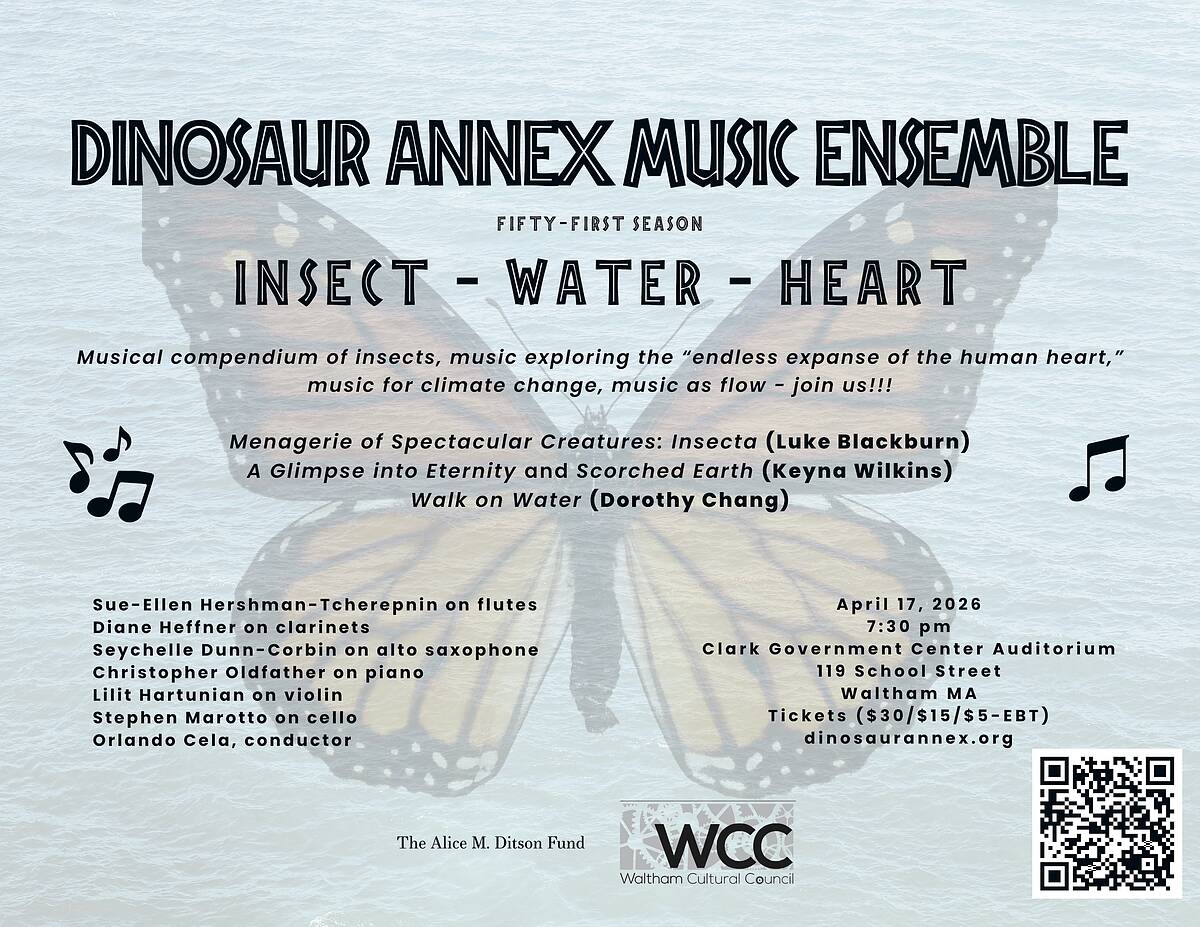 Dinosaur Annex Music Ensemble continues its 51st season with a concert in Waltham, MA, with music focused on mind, body, and environment, as the ensemble continues to explore a new era of passionately bringing cutting-edge music of living composers to a diverse public.