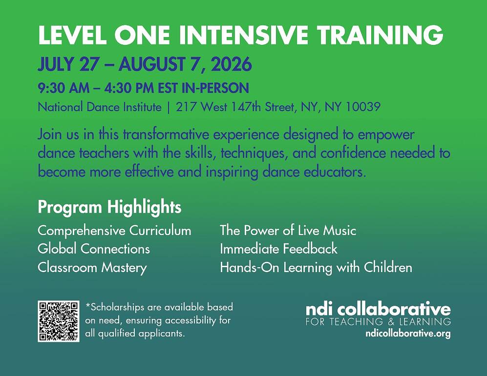 Join NDI for the Level One Intensive Training, a transformative experience designed to empower dance teachers with the skills, techniques, and confidence to become more effective and inspiring dance educators.