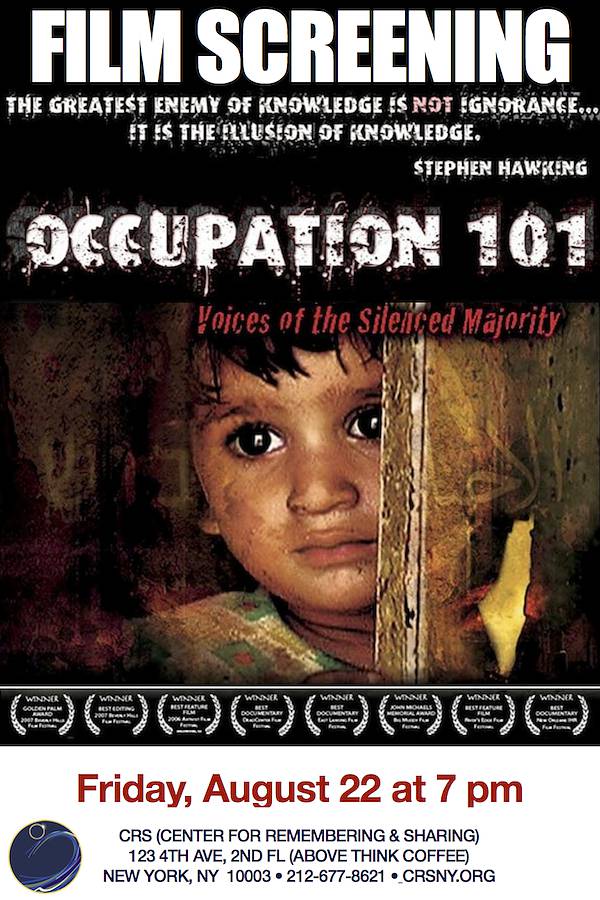 CRS (Center for Remembering & Sharing) invites you to screen and discuss OCCUPATION 101, a multi-award-winning documentary film about the current and historical root causes of the Israeli-Palestinian conflict. Unlike any other film ever produced on the conflict, OCCUPATION 101 presents a comprehensive analysis of the facts and hidden truths surrounding the never ending controversy and dispels many of its long-perceived myths and misconceptions.