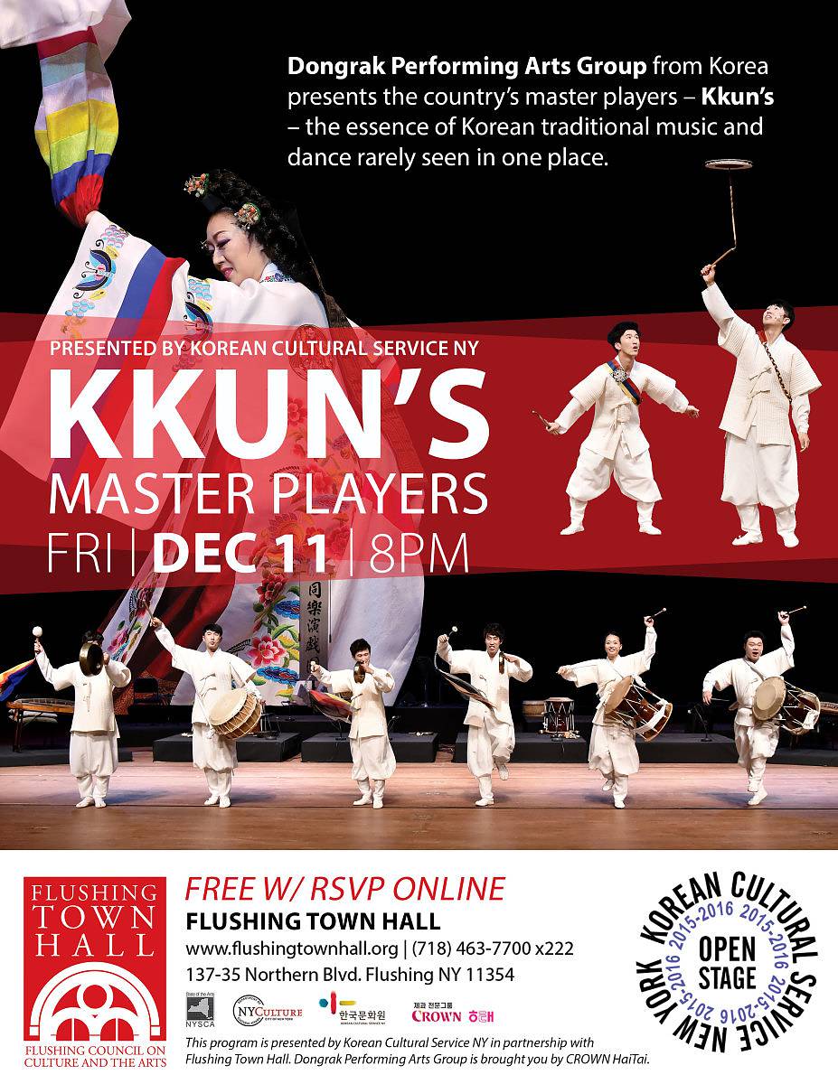 “KKUN’S – MASTER PLAYERS” by Dongrak Performing Arts Group is presented by Korean CulturalService NY in partnership with Flushing Town Hall.
