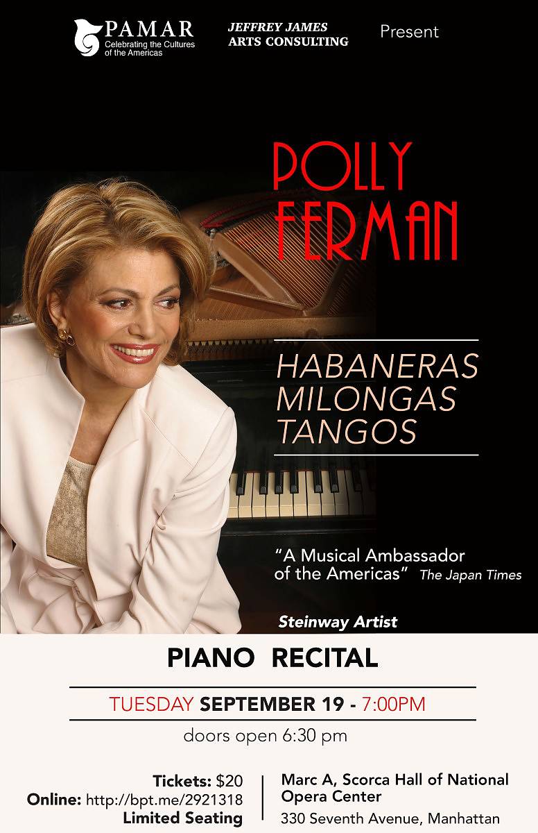 Uruguayan pianist Polly Ferman, a specialist in music by South American composers, will perform a concert of Habaneras, Milongas, and Tangos by Astor piazzolla, Daniel Binelli, Alberto Ginastera, Ernesto Nazareth, Isaac Albeniz, and more. Ms. Ferman has concertized and guested with orchestras around the world, and was featured in a PBS documentary “Tango, the Spirit of Argentina.” Tuesday, September 19 at the National Opera Center.