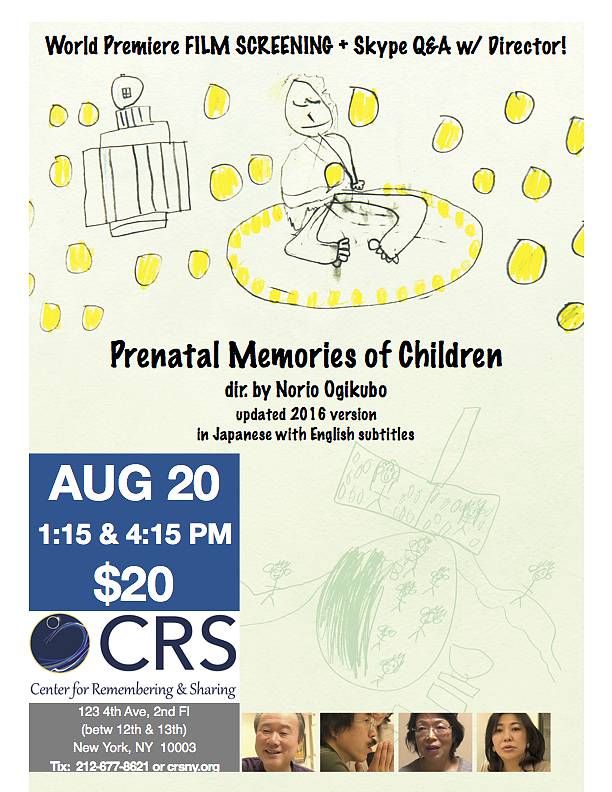 CRS (Center for Remembering & Sharing) invites you to screen and discuss the world premiere of the updated 2016 version of documentary “Prenatal Memories of Children” (94’ in Japanese) w/ English subtitles, dir. by Norio Ogikubo. Whether you are skeptical of prenatal memories or not, you might be deeply inspired and even healed by the thoughts shared by the children in this film and by the commitment of the adults to listen to, respect and learn from the children.