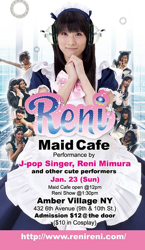 J-pop Singer, Reni Mimura offers Moe style performances, a genre that emphasizes the cute look of Japanese pop-culture with the hip appeal of Japanese animation.What: Reni’s Japanese Maid Cafe & Show!!When: 1/23 12PM - 3:30PMWhere: Amber Village 432 6th Avenue (9th & 10th Street)Charge: $12 at Door (Lunch not included) $10 in CosplayNote: No age limitYou Tube: http://www.youtube.com/watch?v=OCzaJjq1CC4For more Information, http://www.renireni.com/What is Maid Cafe?http://en.wikipedia.org/wiki/Cosplay_restaurantIf you can’t make it, we will stream live for people all over the world to see it LIVE onhttp://www.ustream.tv/channel/reni-live