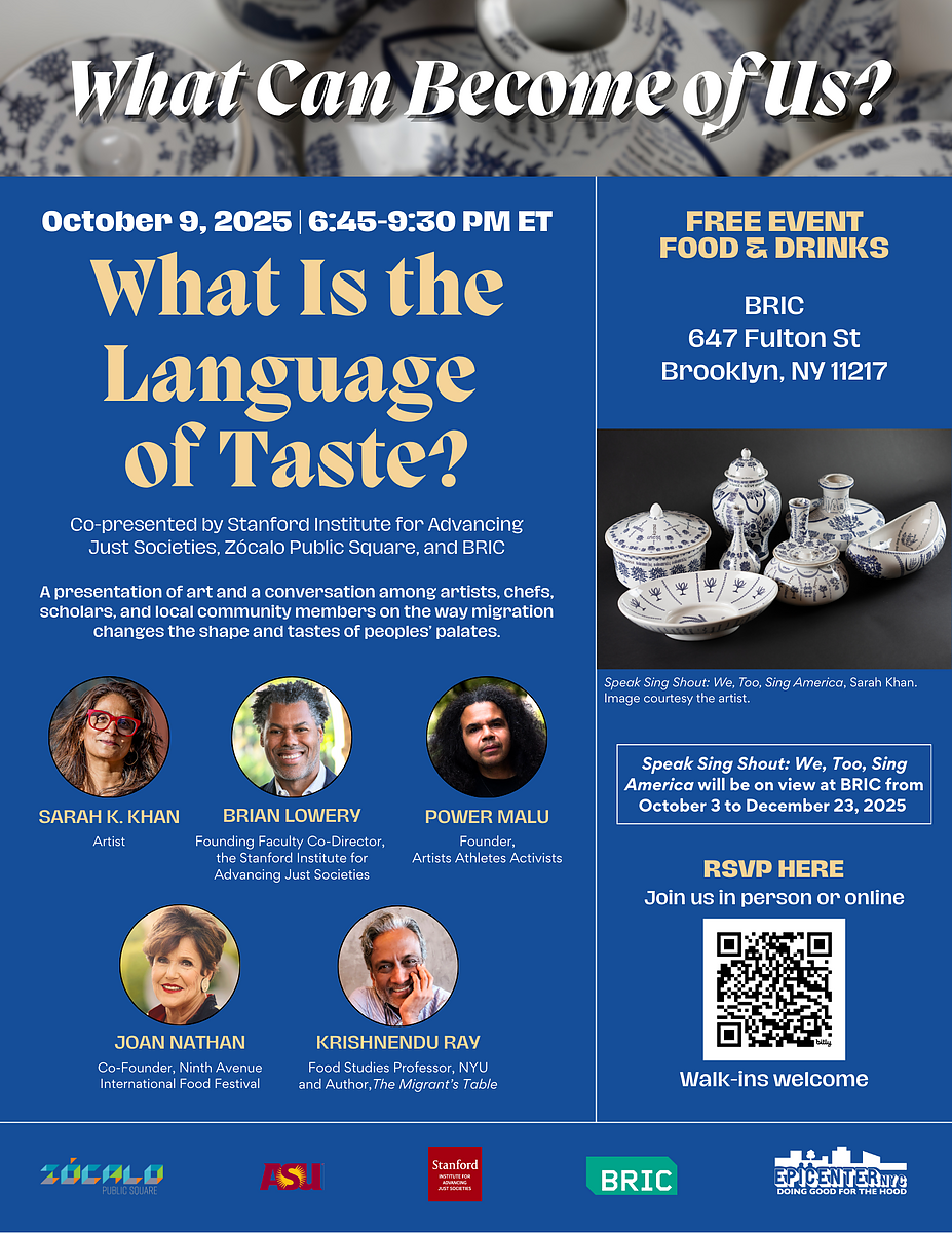 Join IAJS and Zócalo Public Square at BRIC to view the artwork and experience a performance by Khan. A panel of chefs, scholars, and local community members moderated by IAJS founding faculty co-director Brian Lowery will follow, exploring how what we eat, and where it’s from, shape our sense of identity.