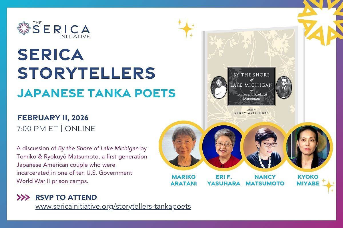Serica Storytellers presents an intimate virtual conversation on By the Shore of Lake Michigan, the award-winning translation of a 1960 collection of Japanese tanka poetry written by Tomiko and Ryokuyō Matsumoto — a first-generation (Issei) Japanese American couple forcibly incarcerated at the Heart Mountain prison camp during World War II and later resettled in Chicago.