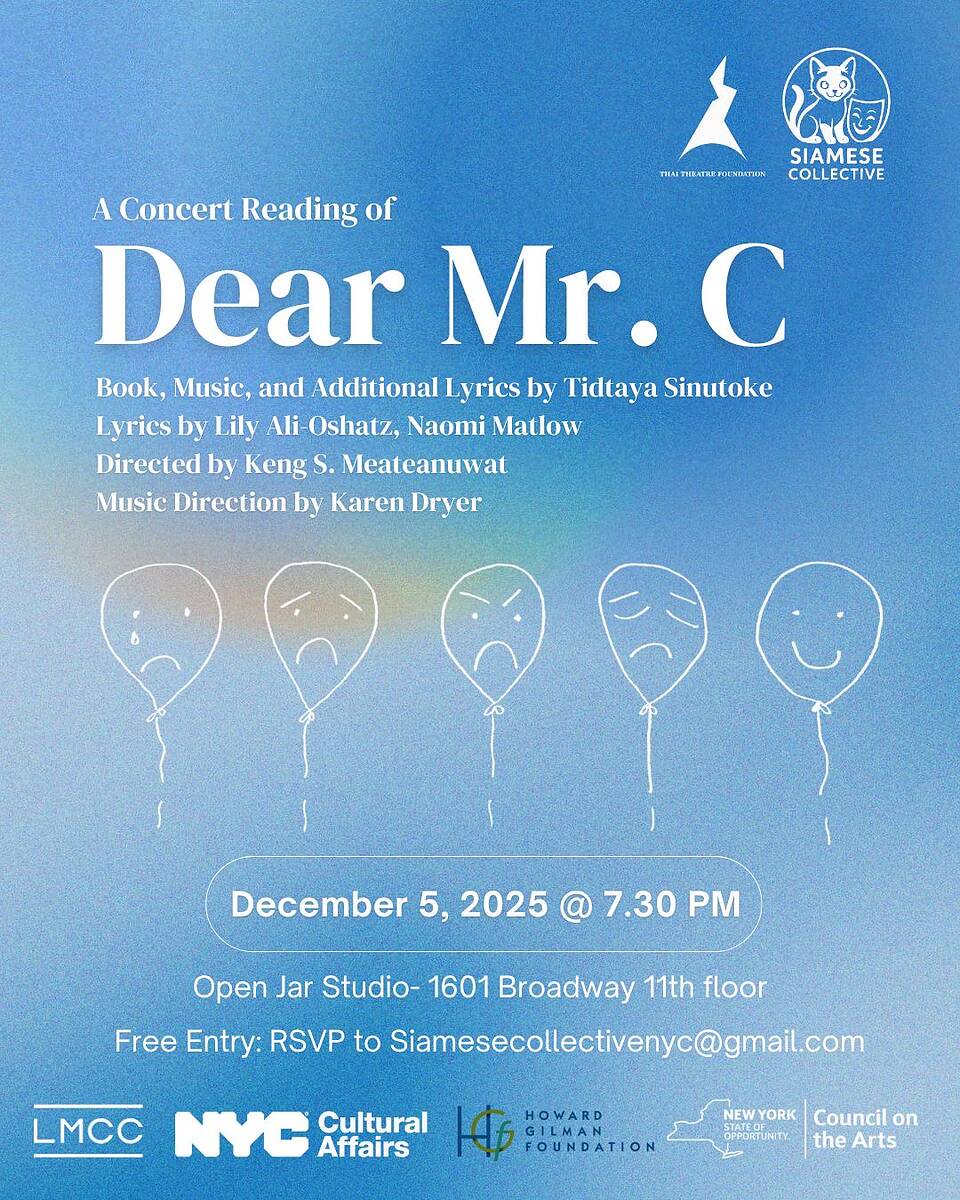 Dear Mr. C was developed as part of the Polyphone Festival, presented by the Ira Brind School of Theater Arts at the University of the Arts in Philadelphia, PA (2022), and later presented by The Crossroads Project at Illinois State University (2022). The musical was also developed in part at Rhinebeck Writers Retreat (2022) and has previously received support from NYFA’s City Artist Corps Grant and the Diverse Voices Playwriting Initiative Award (2021). Most recently, the musical continued its development as part of Village Theatre’s Festival of New Musicals (2025).
