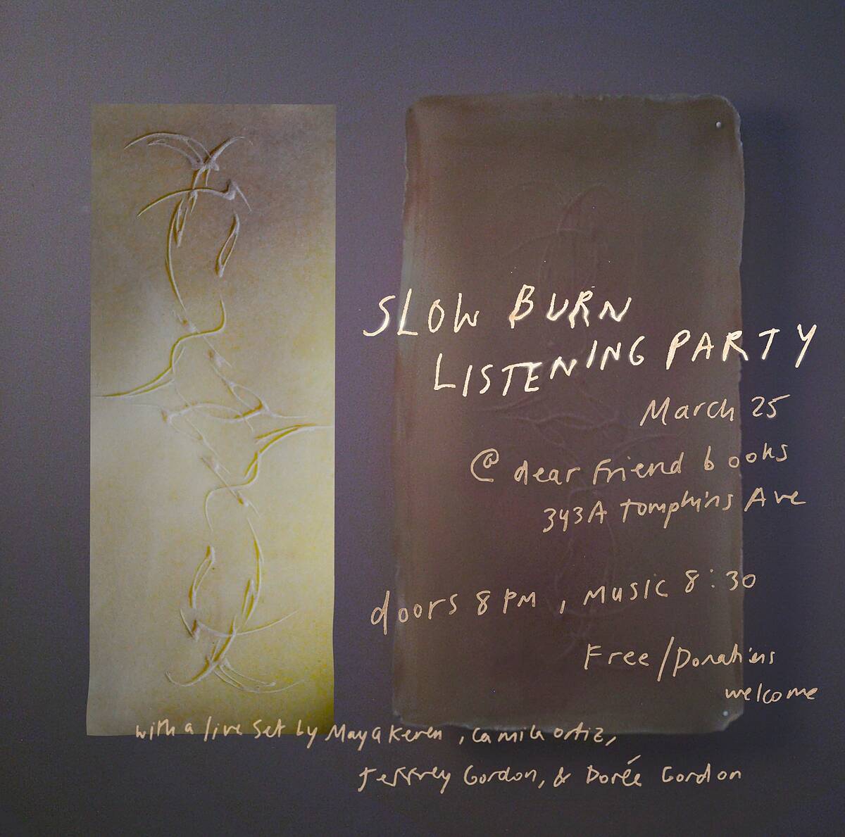Come celebrate Brooklyn-based songwriter Maya Keren’s new solo album, Slow Burn, at Dear Friend Books in Bed Stuy. The night will begin with a listening party, and end with a brief live set by Maya Keren, Jeffrey Gordon, Camila Ortiz, and Dorée Gordon.