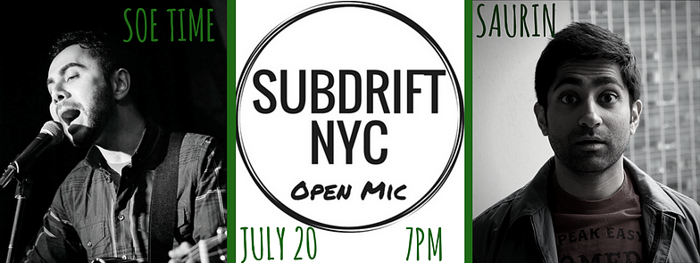 Thursday July 20, 2017 7PM to 9PM We’re delighted to feature comedian Saurin Choksi and musician Soe Time We’ll see you for the usual: awesome standup, music, poetry and a great many things not witnessed by NYC before at Parkside Lounge in the Lower East Side. Sign up for a slot: https://subdriftnyc.typeform.com/to/l7BMwz —– ABOUT SAURIN Saurin Choksi is a comedian living in New York City. He previously appeared on Fuse TV, as the host of White Guy Talk Show–a nightly pop culture comedy show. In 2014 he took first place at the prestigious Boston Comedy Festival. His stand up has been featured on various outlets, including Fox TV and Sirius/XM Radio. Choksi produces Comedians You Should Know NYC and Brown Privilege, two of Brooklyn’s top comedy shows. Choksi spends his free time teaching himself Computer Science & Artificial Intelligence online. He wants to build a robot, who will be his son. ABOUT SOE Soe Time is an independent singer-songwriter. He’s been writing and singing songs since he moved to NY two and half years ago. His songs are based on pure imaginations & inspirations. He plans to release an album in the near future. Until then, he’ll keep on rocking. — We’re a safe space for artists and performers of all stripes. Parkside Lounge 317 E Houston St New York, NY 10002 www.parksidelounge.net/ SUBWAYS: F/M/J/Z to Delancey/Essex — Drop us a line at subdriftnyc@gmail.com — ABOUT SUBDRIFT NYC SubDrift NYC is a 6 year old volunteer open mic group, committed to building a community for NYC artists. We’re part of the national network of Subcontinental Drift mics that started in Washington D.C. and that now stretches across the country.