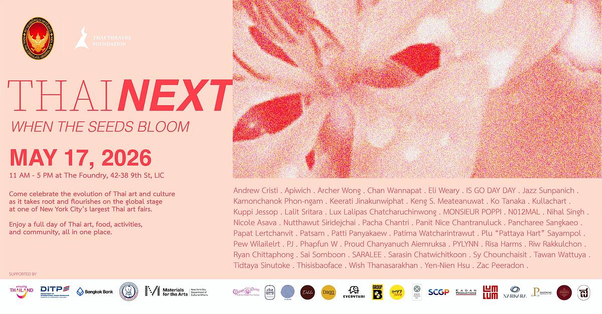 The Royal Thai Consulate General in New York, in partnership with Thai Theatre Foundation, proudly presents “Thai Next 2026: When the Seeds Bloom”, one of NYC’s largest multidisciplinary Thai arts fairs to be held on Sunday, May 17, 2026, at The Foundry LIC, 42-38 9th St, Long Island City, New York. Public admission hours run from 11:00 AM to 5:00 PM, followed by an Evening Reception from 6:30 to 8:30 PM (Invitation Only).