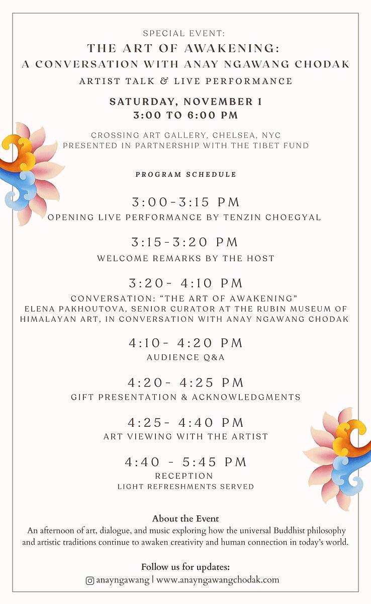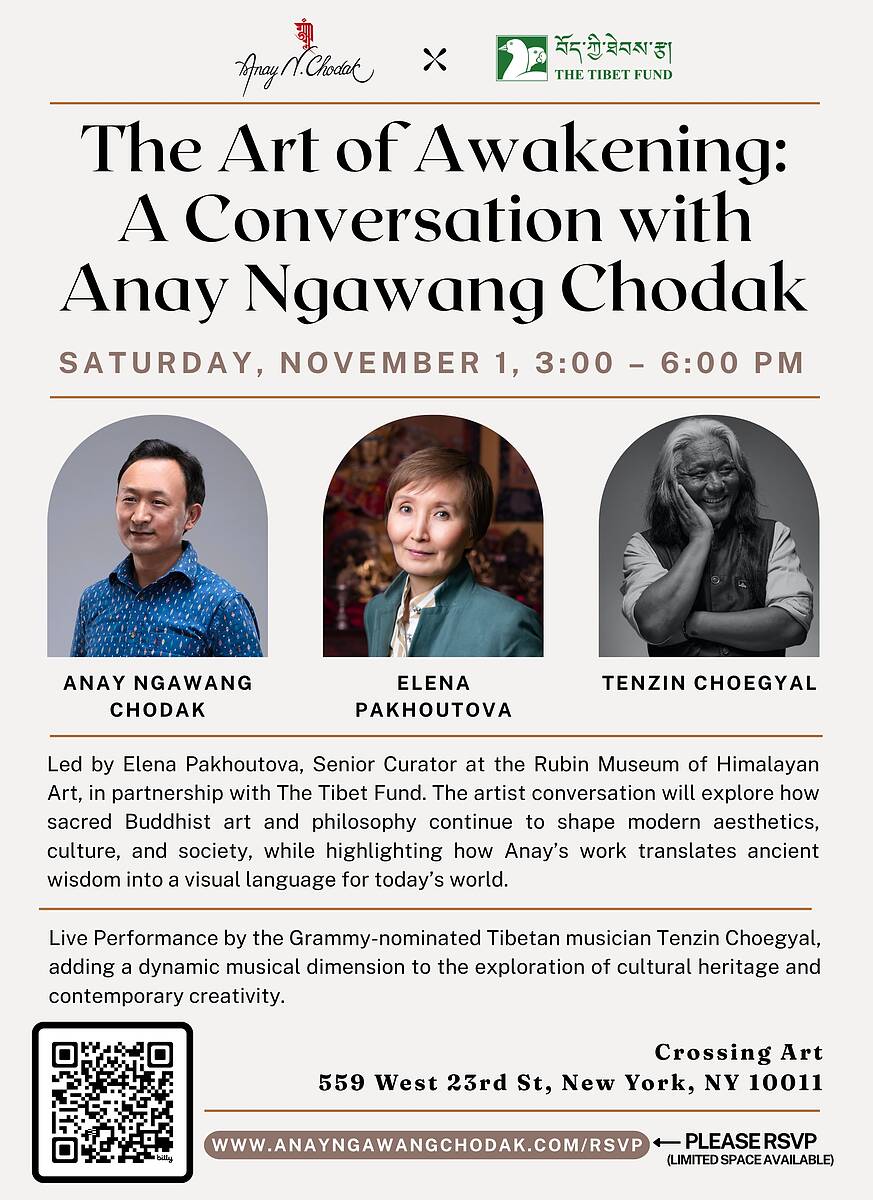 Led by Elena Pakhoutova, Senior Curator at the Rubin Museum of Himalayan Art, in partnership with The Tibet Fund. The artist conversation will explore how sacred Buddhist art and philosophy continue to shape modern aesthetics, culture, and society, while highlighting how Anay’s work translates ancient wisdom into a visual language for today’s world.