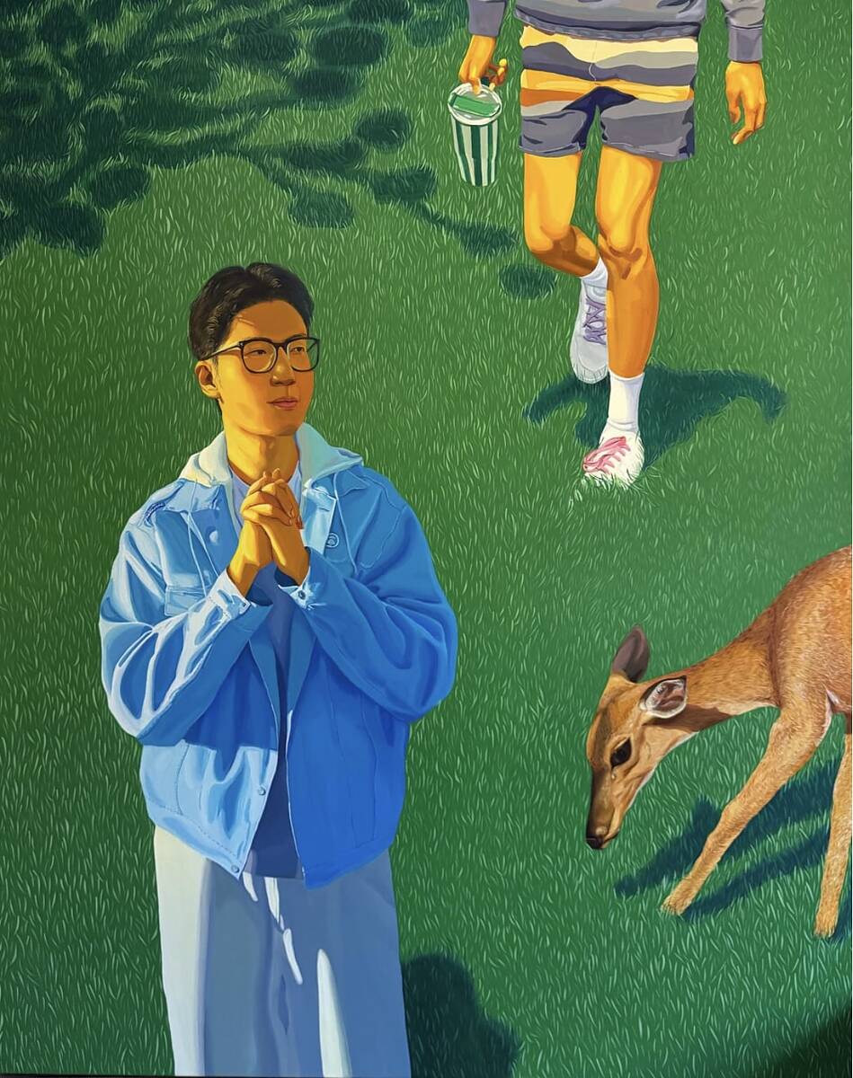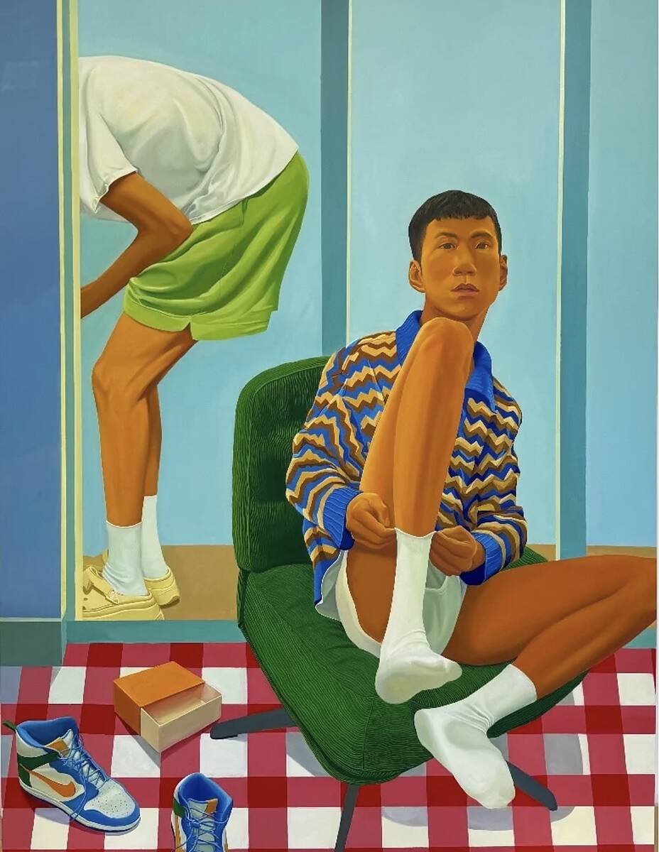 The figures inhabiting Wang’s paintings often appear watching, pausing, or lost in thought — observing a cowboy striptease, absorbing fragments of queer internet culture, or sitting quietly in private corners. They are not typically portraits of specific individuals but composites of memory, cultural experience, and the small, ambiguous moments of the artist’s own formation. Their atmosphere subtly recalls the coded desire of Paul Cadmus, the observational tension of Patrick Angus, and the tender introspection of Hugh Steers, while also resonating with the highly stylized, emotionally charged sensibility of Kyle Dunn, whose work similarly blends theatrical lighting, queer desire, and sculptural figuration.