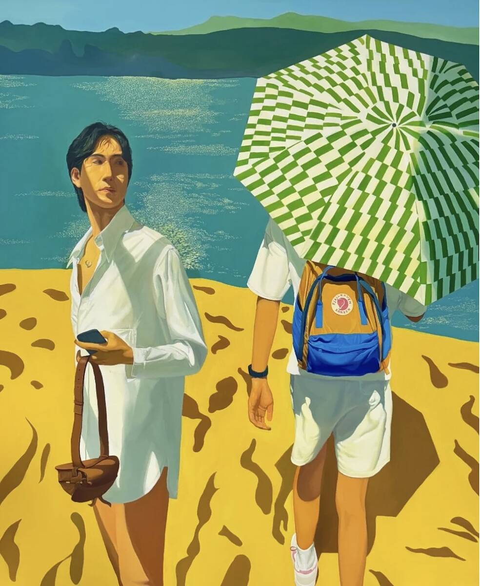 In his early period, Wang briefly drew on modernist precedents — most notably Bonnard, from whom he took the play with color and a pointillist manner, both of which he later moved away from. In this newer body of work, the surfaces flatten, the palette tightens, and the compositions move toward the emotional clarity found in certain strands of queer figurative painting. His bright, distilled chromatic fields resonate with the psychological temperature of David Hockney’s works from the 1970s and ’80s, where color becomes a register of longing and interior emotion.